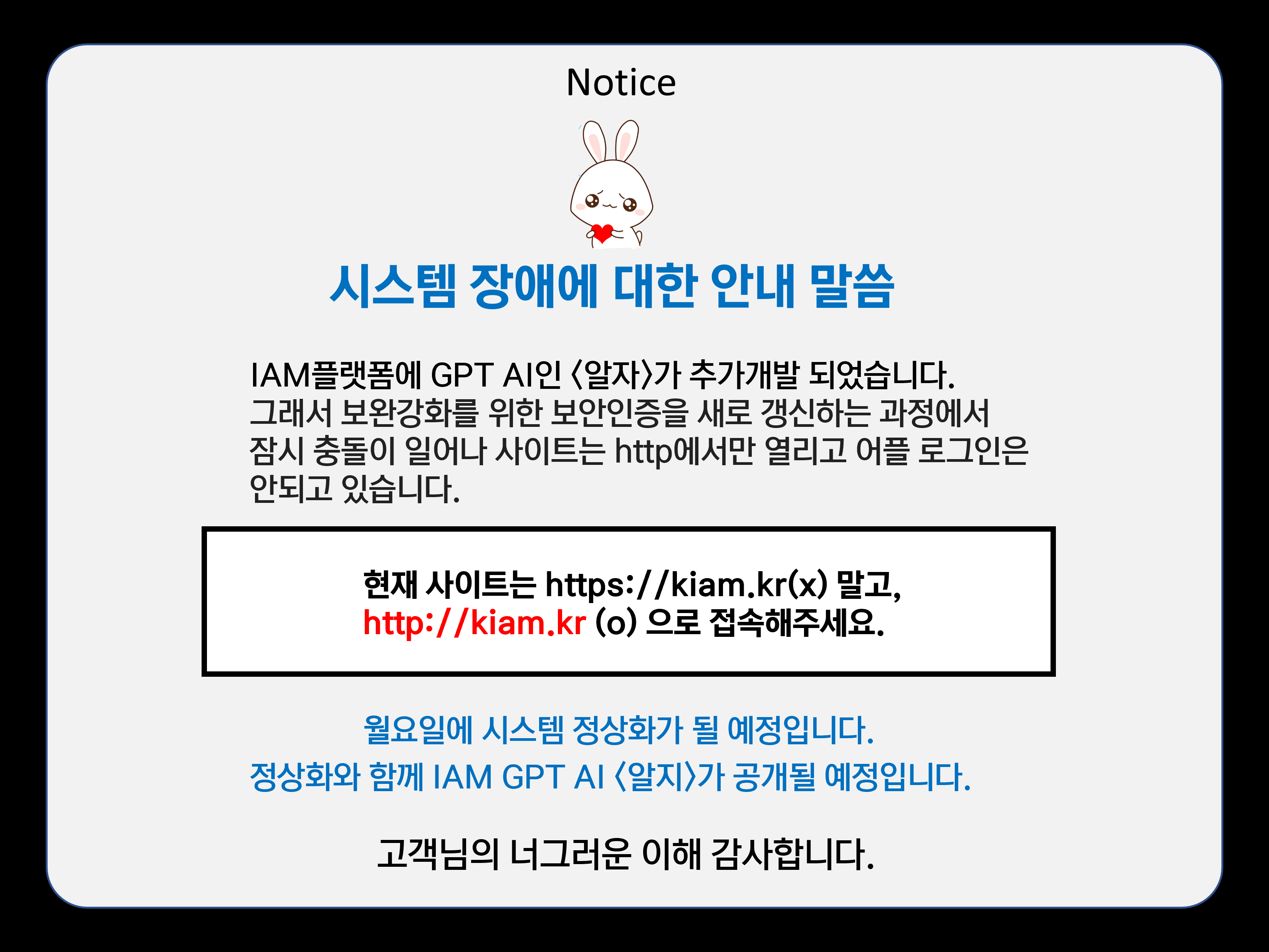 전체 [공지 제230306-02호] IAM플랫폼 시스템 정상화 공지 2023-03-06 22317