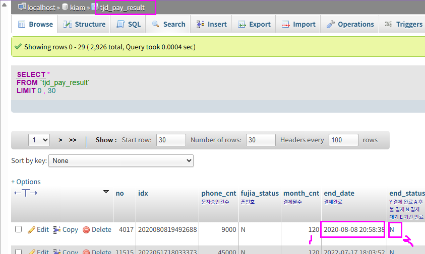 1) tjd_pay_result 디비테이블에서 1번 일시를 오늘 현재 시각 즈음으로 변경
